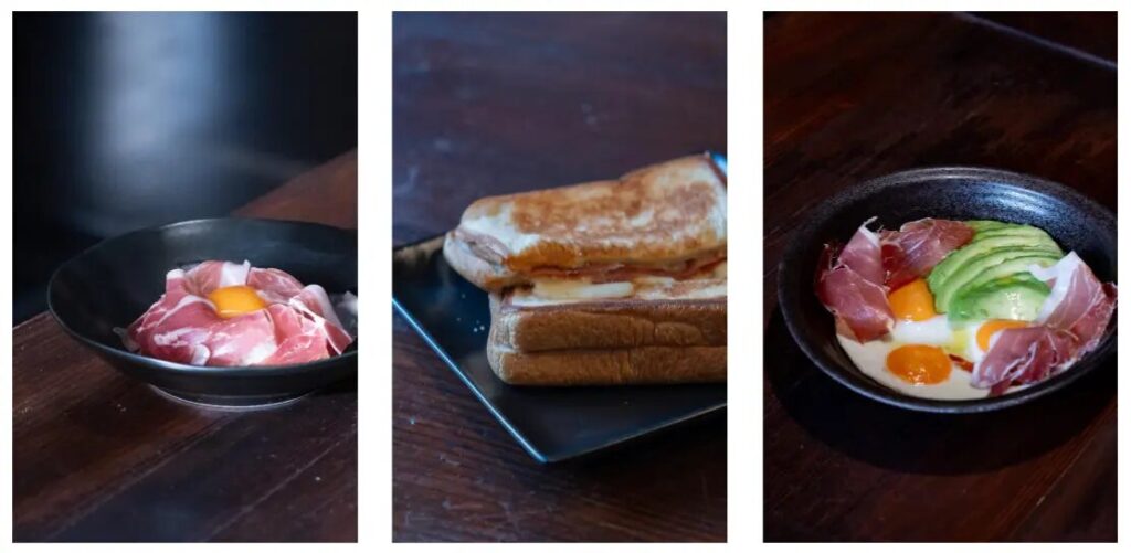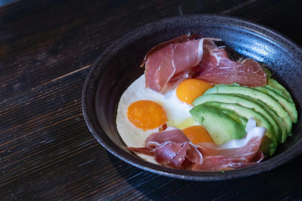 目玉焼き、アボカド、そしてハモン・コンソルシオセラーノを盛り付け、フォークで卵を崩して全体を混ぜ合わせるだけ。ハムと卵の程よい塩味に、アボカドのまろやかなコクが重なり合い、満足感あふれる味わいを楽しめます。