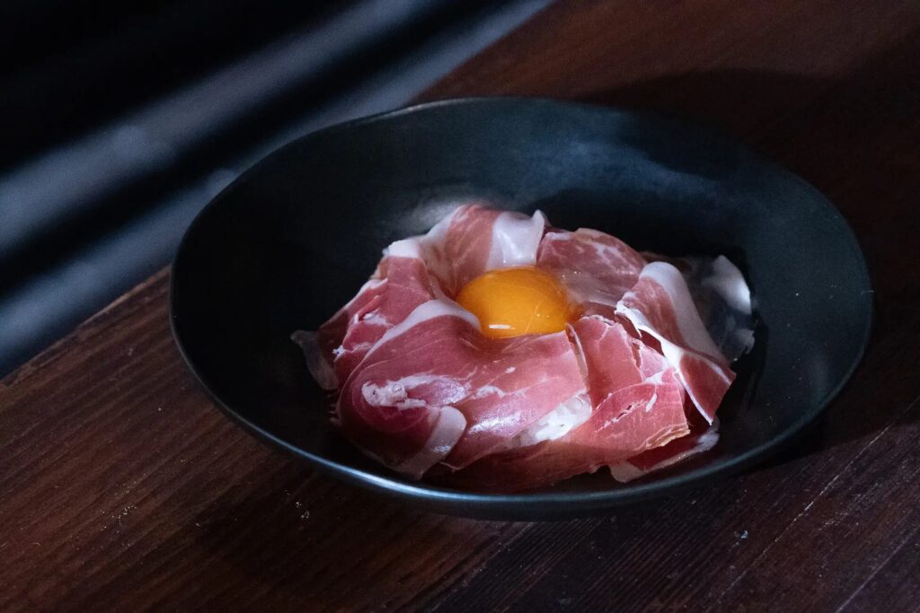 温かいごはんの上に卵黄をのせ、薄くスライスしたハムを重ね、香りづけに少量の醤油を加えます。両国の食文化を融合させた、シンプルでありながら奥深い味わいの一皿です。